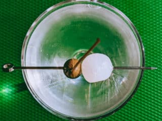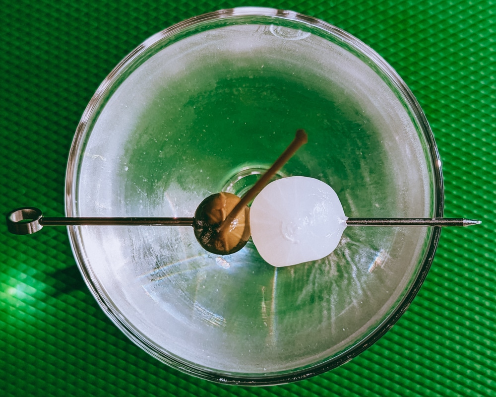 To put my own spin on the classic Gibson cocktail, I’m making it dirty. I’ve added pickled onion brine and caper berry brine to the mix—because Knives Out is a crime caper, after all.