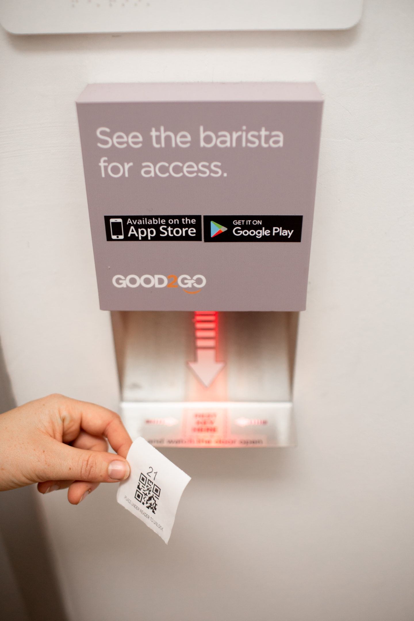 You may notice Good2Go bathrooms in coffee shops, etc, around the city. If you’re a patron of those shops, don’t worry, you can still use the bathroom for free and without the app – just ask a staff member for the access code and they’ll hand you a little piece of paper that looks like the photo below! You can use it to scan at the door and enter the bathroom that way.