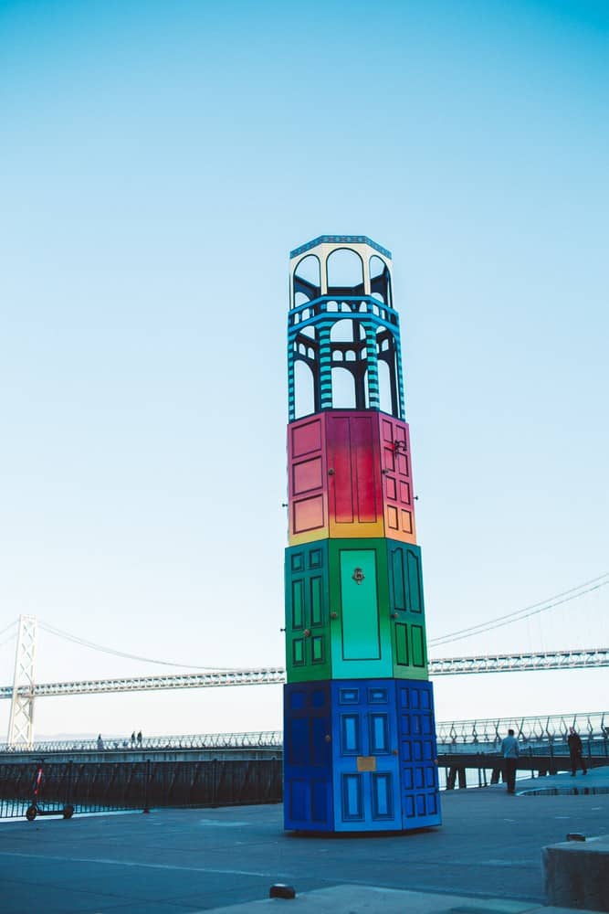 Near Pier 14 San Francisco and standing at over 30 feet tall, this rainbow Coit Tower looks simply stunning with the Bay Bridge backdrop. It’s a public art piece by artist Sean Orlando, but only a temporary installation according to the plaque, though I can’t find a confirmed date on when it’ll be taken down. Hence a bit of our urgency to beeline over there the day I found it.