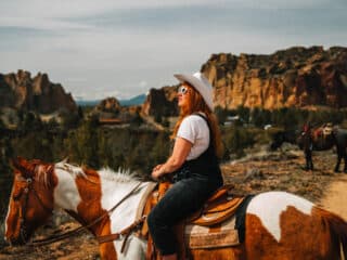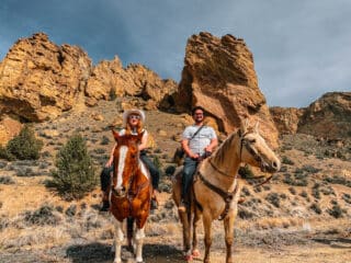 I think Smith Rock horseback riding is such a unique way to experience the park. We lucked out on perfect 70-degree weather, but it gets hot here in the summer and personally, I hate hiking in harsh heat. Instead, you do these Oregon trail rides around the park to soak in nature while the horse does the hard work for you.