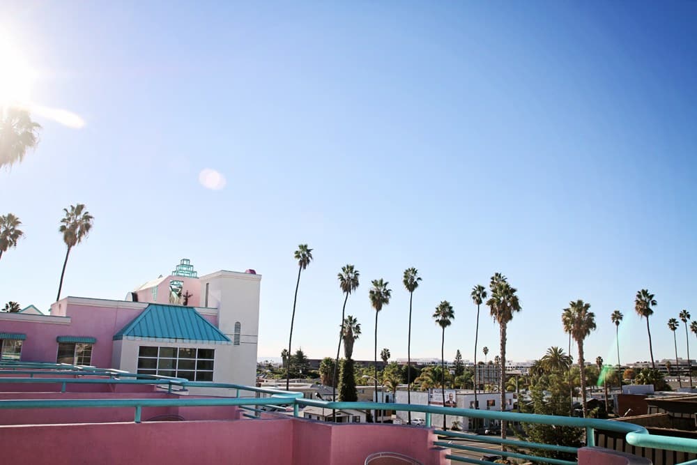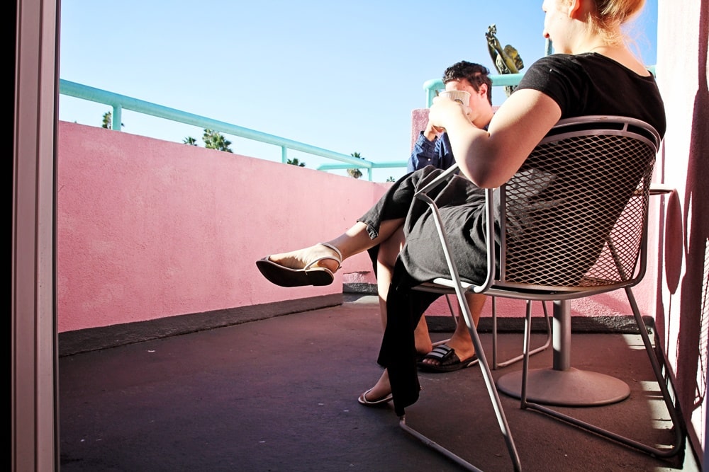 So I started calling other hotels. I googled up Santa Monica Hotels and started down the list. A few places didn’t answer, and a more said they didn’t have any rooms free. A film festival was in town and many hotels were booked up ages ago. I called 6 places and Days Inns was number 7. To my sweet relief, they actually had a room available and, as you read earlier, we were checked in and I was in pjs within 20 minutes. And, even though I would have rather not have gone through all that, I’m really happy we ended up at the Days Inn. We had this great patio that overlooked the city and I was in love with how the hotel was painted pink.