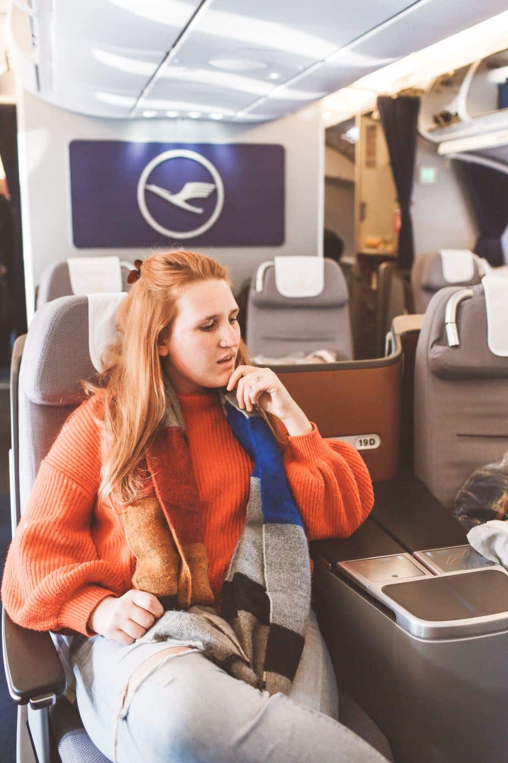 I prefer a window seat because I use the wall of the plane to lean my head against to sleep. I’m 5’5” so I don’t have too much trouble with legroom. But, my friend Melanie is an amazon woman and always picks an aisle seat so she can stretch her legs out. If you do an aisle seat, just make sure to bring a neck pillow so you have something to support your head while sleeping since you won’t have the wall!