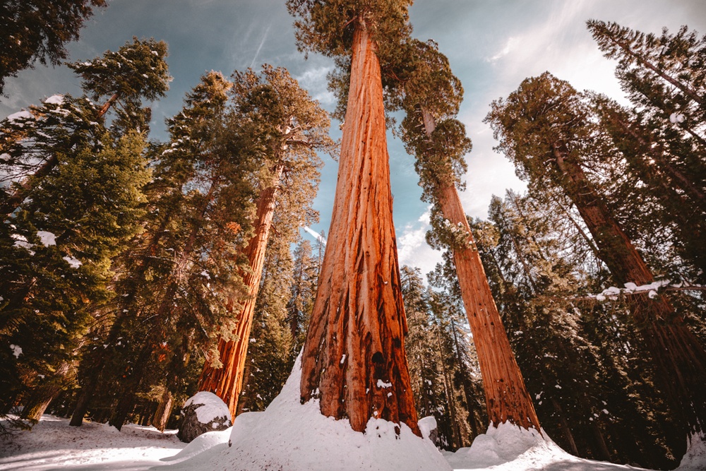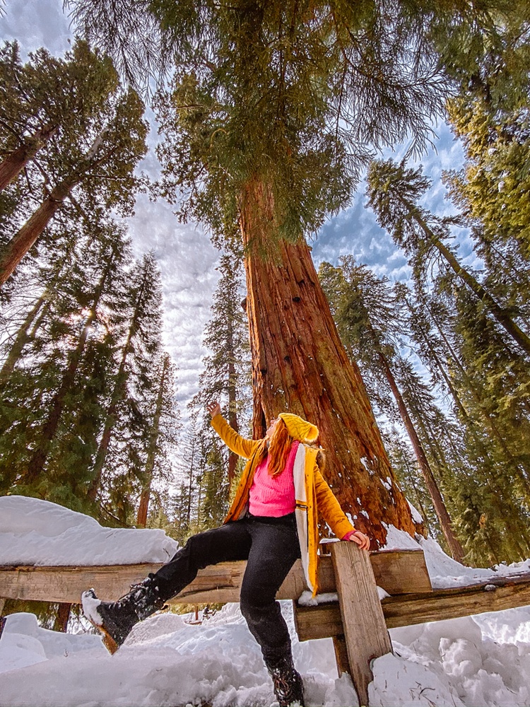 Usually, it’s a big NO-NO to stand directly under a Sequoia tree (their root systems are super shallow and walking around their base can hurt them. That’s why so many are blocked off with fences.) BUT when there is 6 feet of snow on top of the roots protecting them, it’s safe to go hug the tree or take a photo at the base.