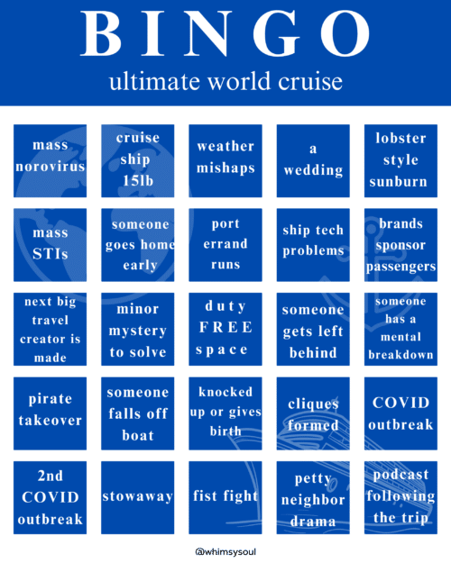 @whimsysoul Ultimate World Cruise Bingo Card!!! who’s playing with me? 🛥️ 🌊 🌍 🍿 #ultimateworldcruise #royalcaribbean #worldcruise #cruise #bingo #travel #whimsysoul ♬ original sound – Kara • San Francisco