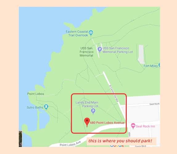 Park in the Lan’s End / Sutro Baths parking lot at 680 Point Lobos Ave. It can get busier in the evenings but we almost always can find a spot. If it’s full, resort to street parking around Geary. This area is a popular tourist area, so make sure to not leave valuables in your car as break-ins sometimes happens.