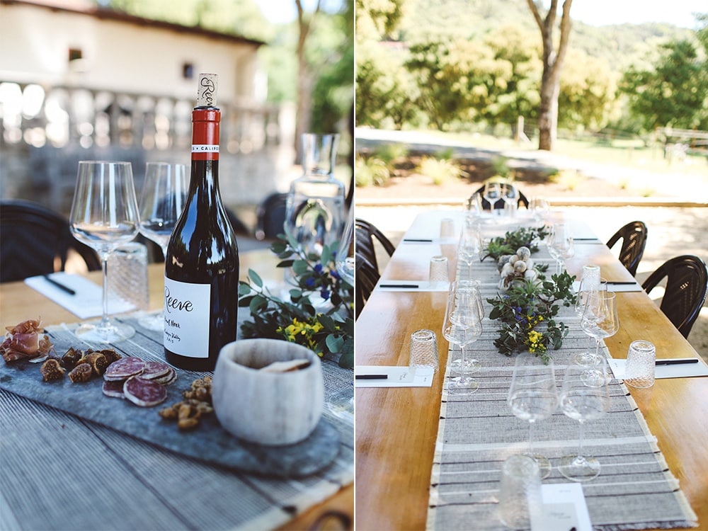 11am: And just like that, we were off to the countryside to visit Reeve Wines. Sunshine and windows down the whole way. The entrance sign is small, we drove right by it the first time, opps! I’ve been to many a wineries in Sonoma and Napa, and I have to honestly say that Reeve is now on my top 5 favorites list. From the long winding driveway taking you deep from the main road, to seeing the string lights in the barn when you roll up to the Italian-style deck filled with plants and sunshine, this spot couldn’t be cutest. Then, when you step out, the only thing you hear are birds, the wind through the trees and music softly playing in the background. Most tasting are outdoors and this, my friends, are the way tastings are suppose to be. I think I speak for all of us when I say that it’s always a bummer when you arrive at a winery only to be pushed to the back of a dark room at a crowded bar, your Som quickly rushes you through tasting and you are in and out in under 20 minuets (has happened more time than I can count!). Reeve though, is the complete opposite.