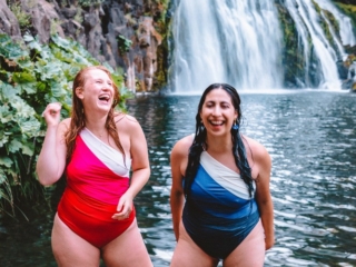 There aren’t bathrooms down near the water and the restroom up top on the parking lot wasn’t very clean. I recommend you wear your swimsuit under your clothes so you can easily shed the hiking gear and hop into the water! All of us girls are wearing Summersalt swimsuits in these photos.