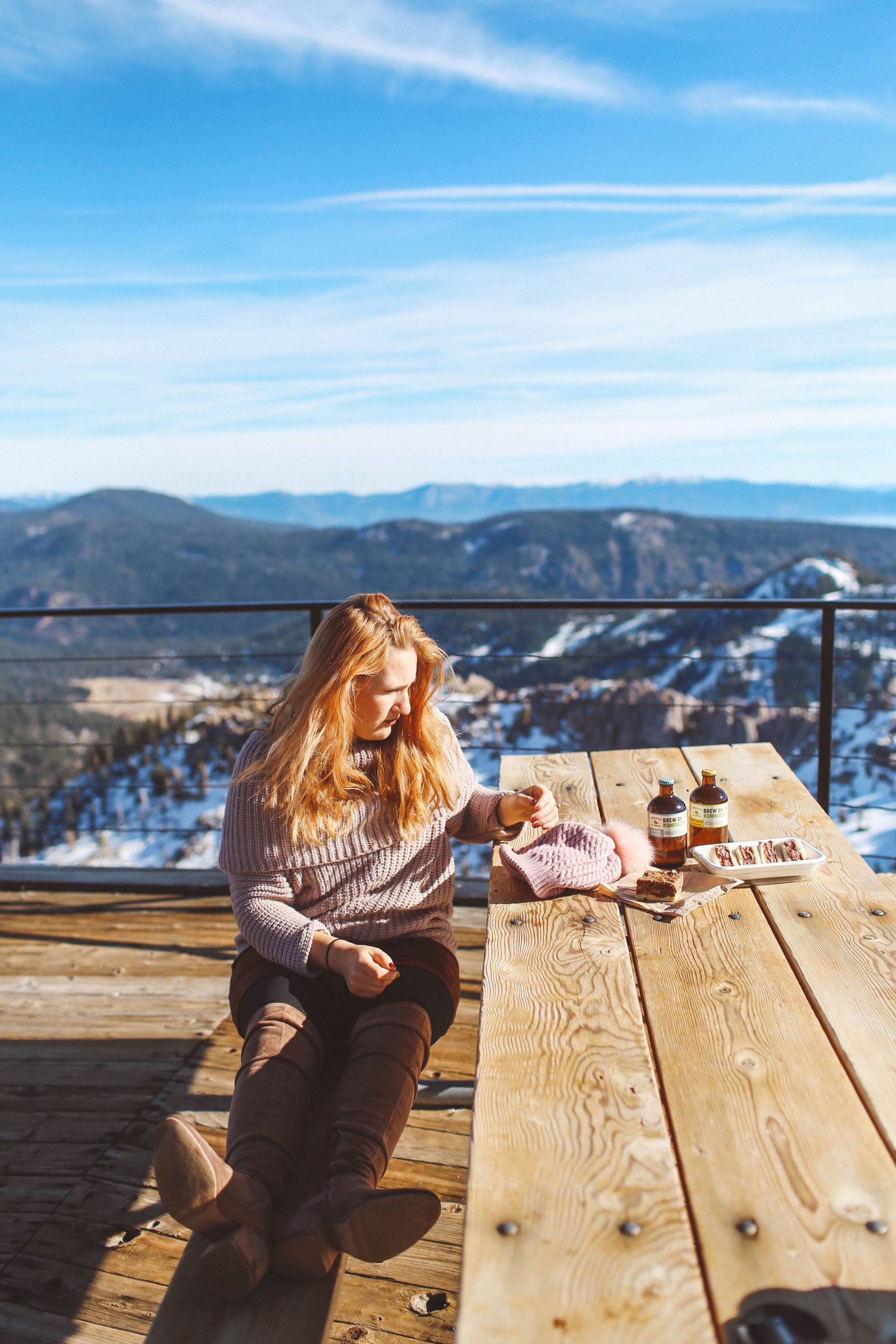 For lunch, we took the tram to High Camp – this was the highlight of our trip for both of us. The views up the mountain are priceless. Usually, there is the Terrace Bar open, but it is currently under renovations. No matter, because the Marketplace served as a great stop to grab a light lunch and head out on the giant patio on top of High Camp for a picnic in the sunshine. From this high up, you can see the blue water of Lake Tahoe between the snowy peaks.