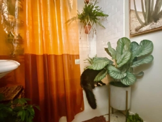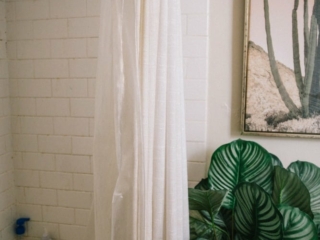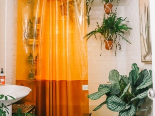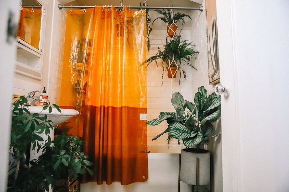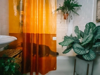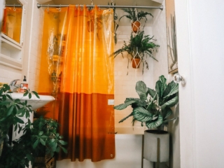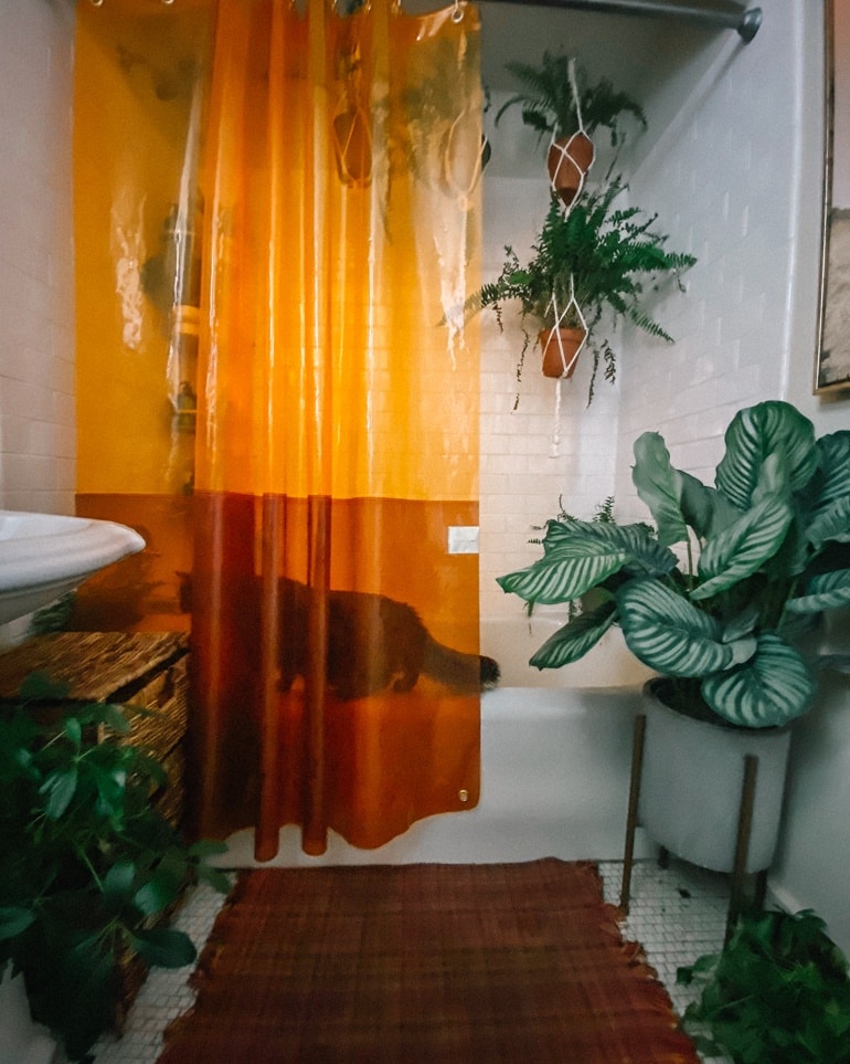 Anyways, I knew that was staying. When picking curtains, It thought the pink clear shower curtain was a little to bright neon pink, but the orange felt closer to desert sand to compliment the painting. We’ve had it for a couple of months now and so far, the shower curtain hasn’t held onto any soapy residue or anything and I love how it brings light into the tub area for all my shower plants!