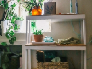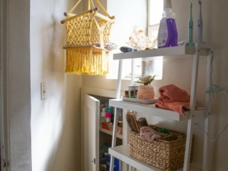 My proudest DIY project is how I transformed my boring white shelf for under $20 to a modern boho bathroom piece. I could have picked solid pieces of wood to make this a more farmhouse feel, but I wanted the room to still hold onto that bohemian bathroom style, which is all about layering things together.
