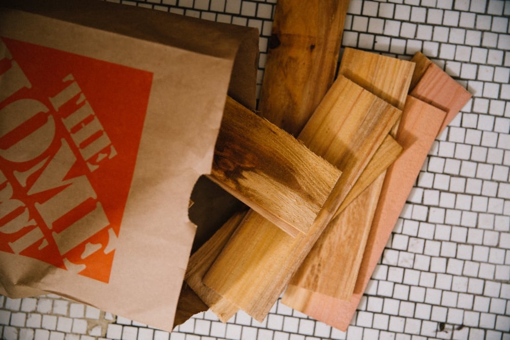 So, I bought a couple of thin pieces of wood from Home Depot for like, $7 in total. They cut wood there for you for free so I had them make the pieces smaller since they were originally about 10 feet long. HomeDepot couldn’t cut the wood to my exact needed dimensions. So, I bought a $5 handsaw and some wood glue. I used clamps we already had from my photography backdrop and I kid you not, I used one of our dressers in our closet as a makeshift cutting table.