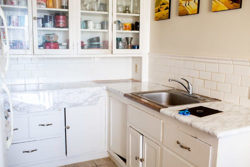 Finding the perfect adhesive faux marble contact paper was challenging. We cook a LOT in our household, so we needed something that could stand up against all the water around the sink and the frequent wipe-downs.