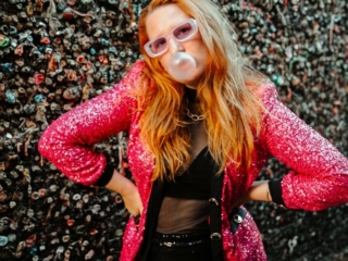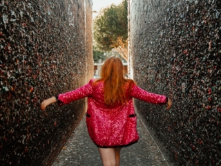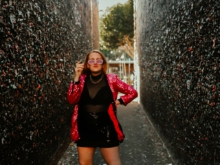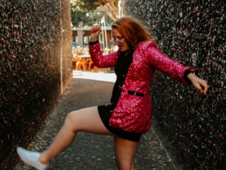 I love to support local shops. So I bought a pack, went back to my hotel, pulled on this pink glitter outfit blazer, and grabbed my friend. I wanted to do a retro photoshoot in this alley!