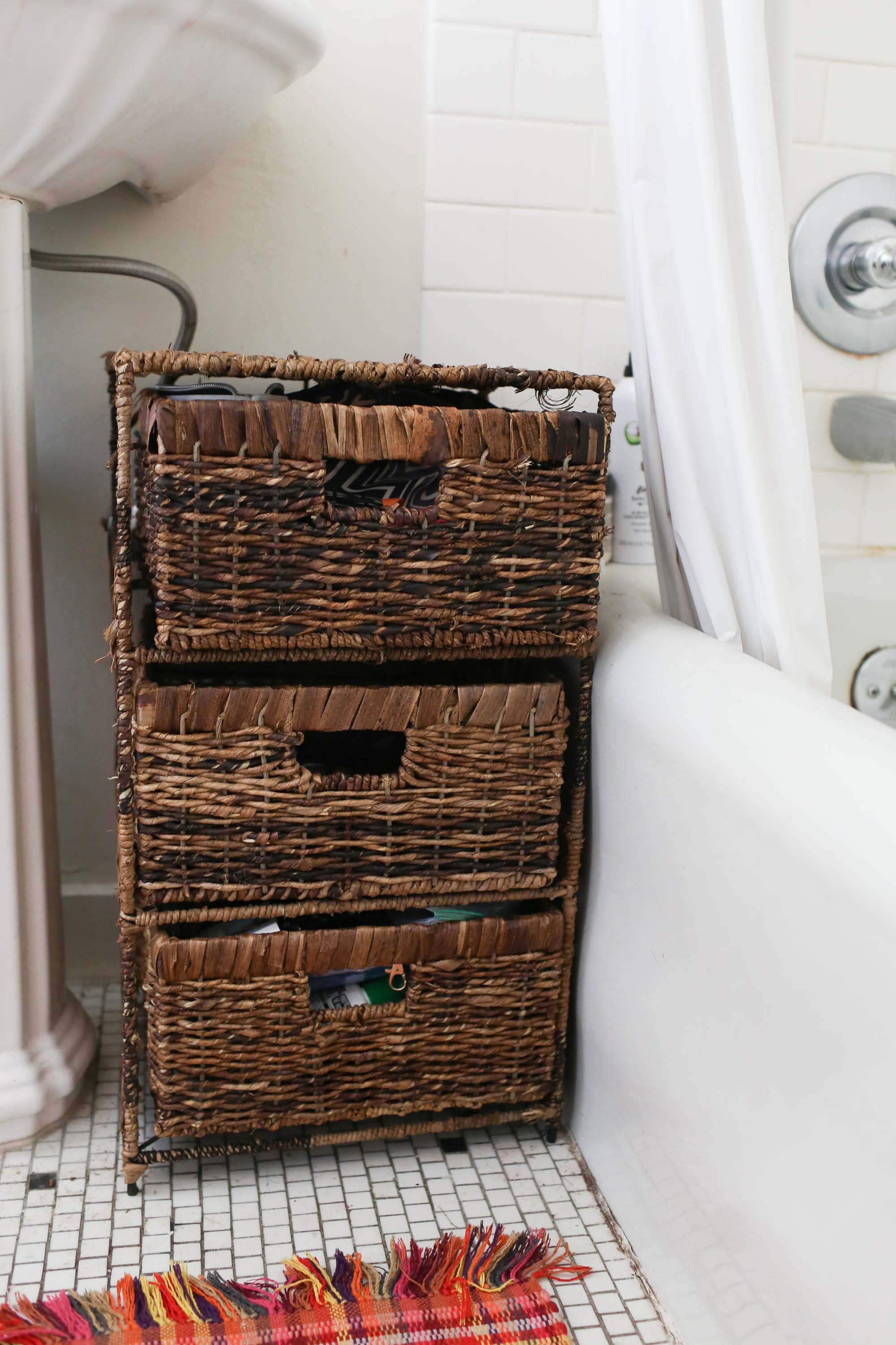 Lastly, we got a wicker storage drawer system to put by the sink. The top drawer has my makeup, the second drawer my lipstick and the bottom has random beauty products. My makeup used to live in the closet on my dresser, but now it’s all in one place and in the bathroom where it belongs!