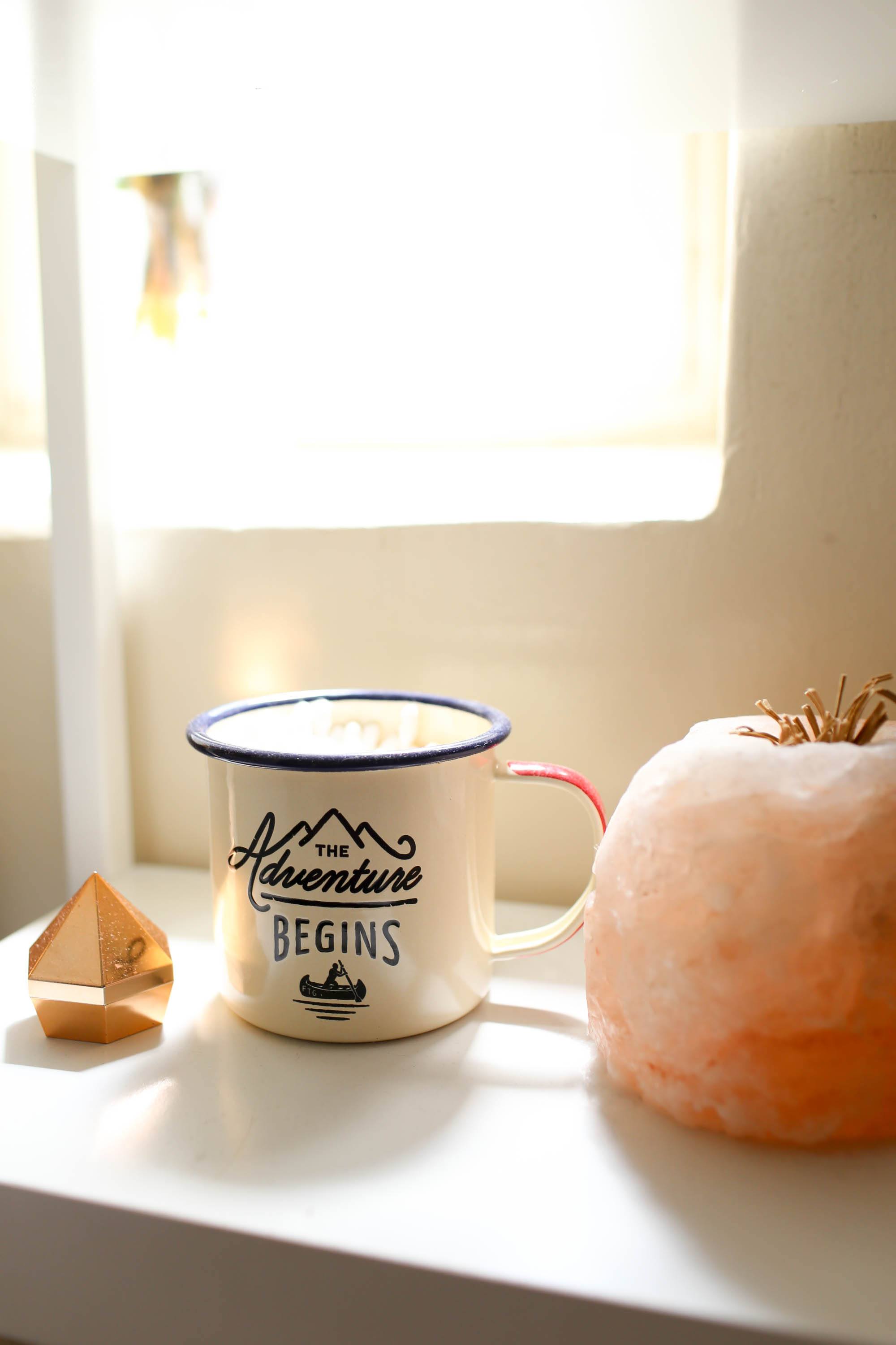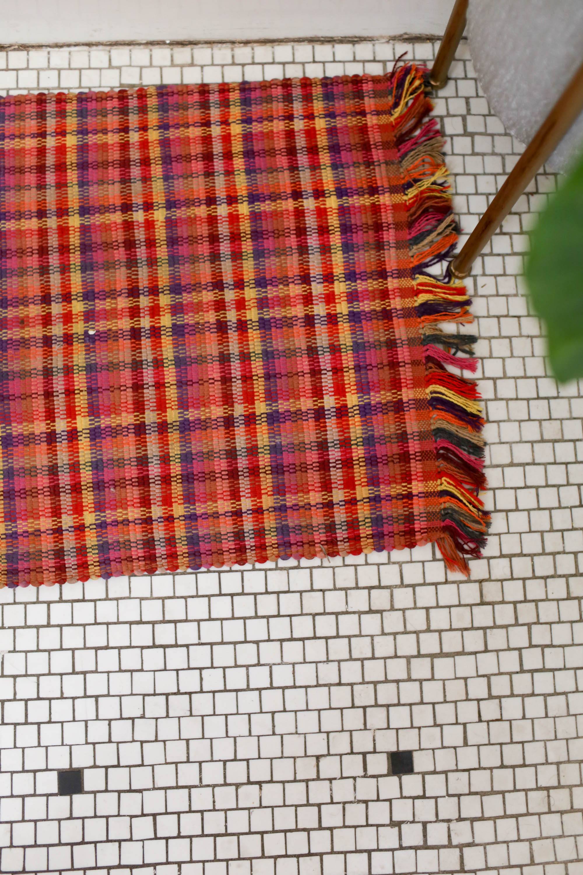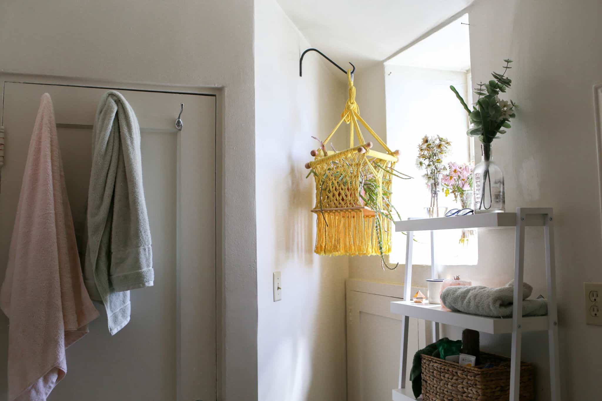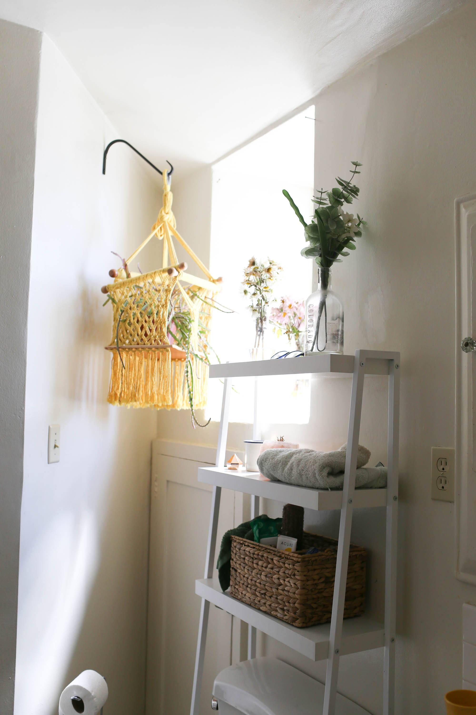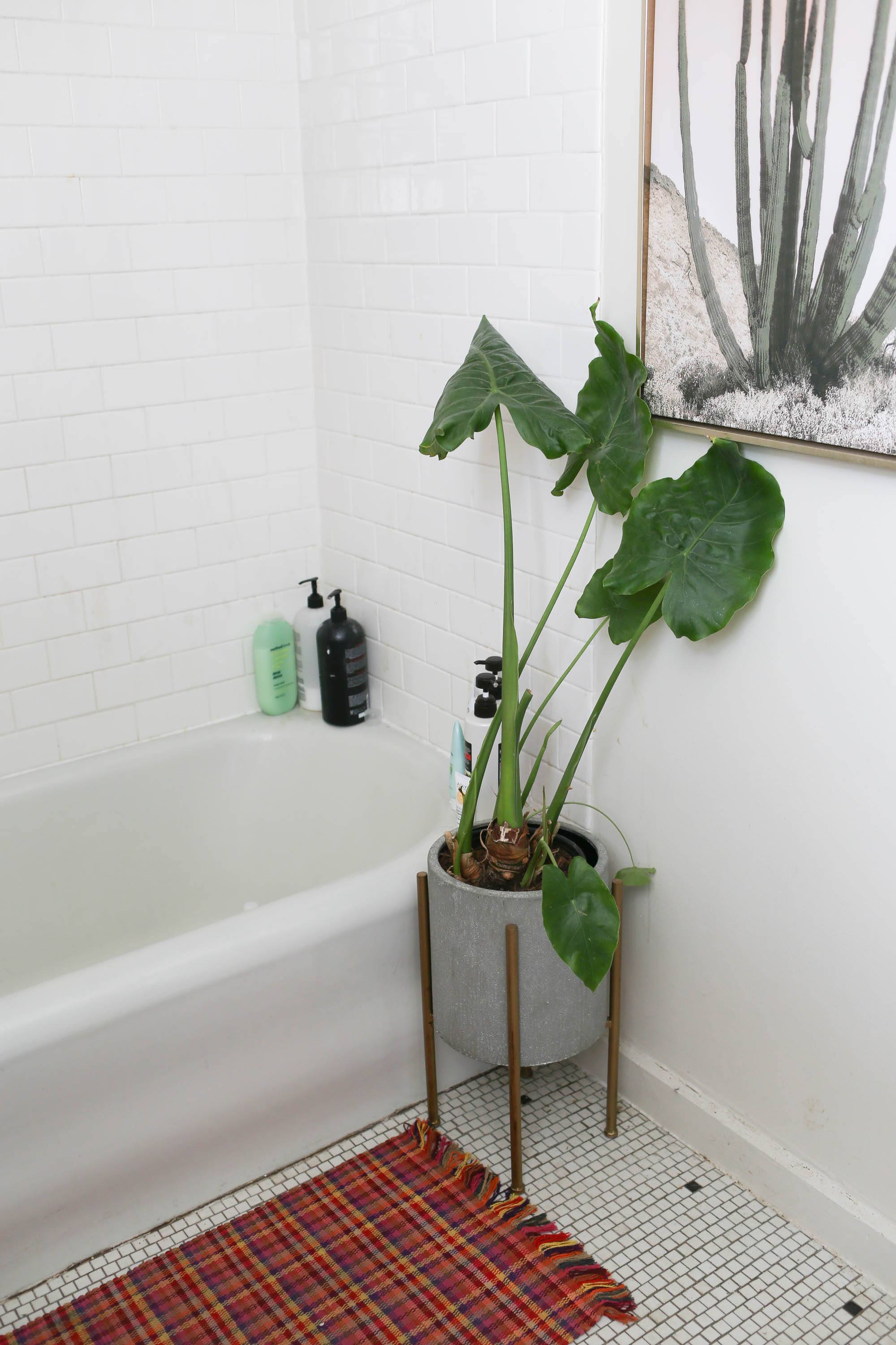 To really draw the room together, I got this big cactus painting from World Market, which adds a delightfully whimsical touch to the whole room. I got this plant stand from World Market as well and put an elephant ear in the corner. It’s not 100% happy here, so we may be swapping this plant out for something new in the future. Our colorful bathmat is one I picked up on a trip to Nicaragua. So is the yellow hanging plant holder which we put in the corner for a pop of color.