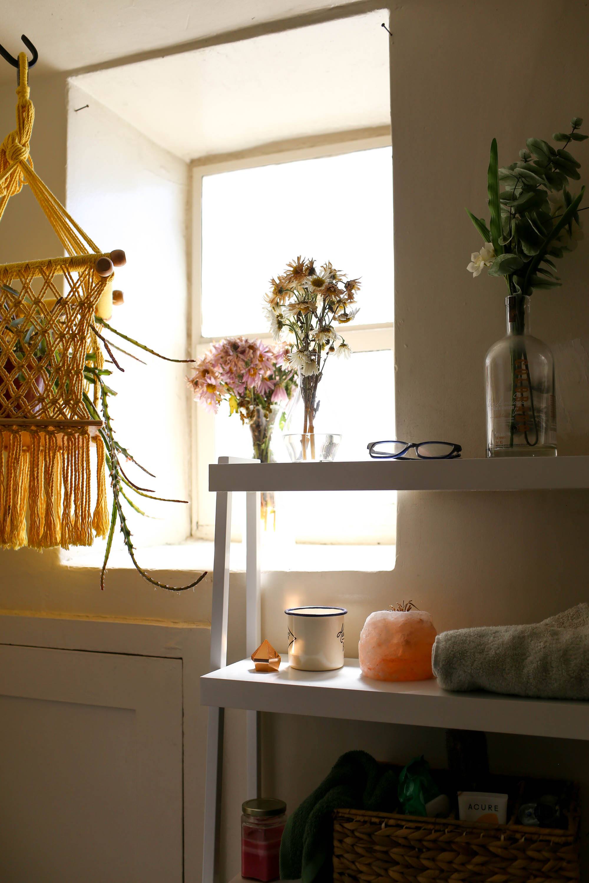 We settled on this shelf from Target that sits behind/over the toilet to add shelving space in an area that was previously just a blank, unused wall. I found this wicker storage basket at Ross and it’s a perfect caddy for my daily things; my hairbrush, facewash towel, contacts, leave-in-conditioner. On another shelf, we have our handtowel and a cup to hold my cue-tips.The top shelf is where I now keep my glasses, phone when I’m listening to music and flowers for decor. This section is the most-used part of our bathroom, as it’s now all that surface space we lacked before.