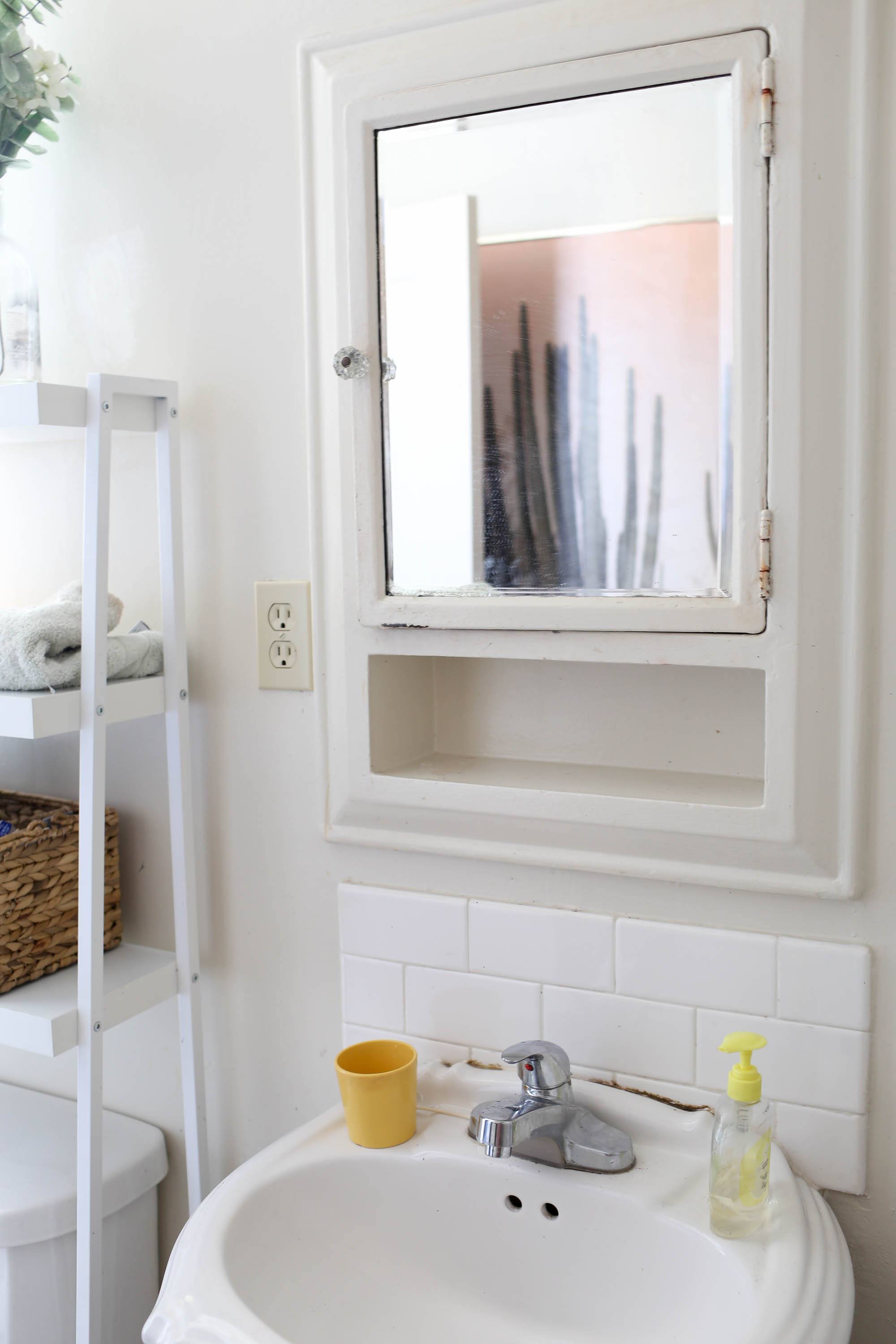 Our bathroom is a decent size for a city apartment. It’s big enough that Robin and I can both stand in it, but it’s not huge by any means. Our biggest struggle with this room was surface space and organization. Our sink is a stand-alone sink with just enough room to put a cup and soap on the sides. For makeup and hair styling obsessed girls like myself, not having enough places to store my products was a huge pain point.