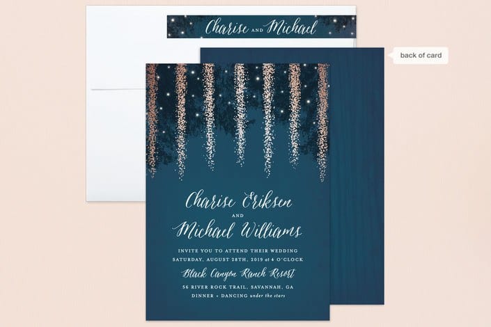 I had lot of fun designing our invites with Minted. They are my go-to source of delightful paper products and art, and it’s easy to see why. Their wedding invite section alone has hundreds of different designs that are totally customizable. I immediately fell in love with our design. It was on the first page and I thought “THAT’S THE ONE!” but made myself look at a lot more before coming back to it. Our wedding is at my father’s house, the house I grew up at in the Wisconsin countryside. It’s going to be a mix of rustic and whimsical (think lots of string lights, cute decor and bonfire pits). Most of the tables will be under a set of trees and lights, so this design really spoke to me.