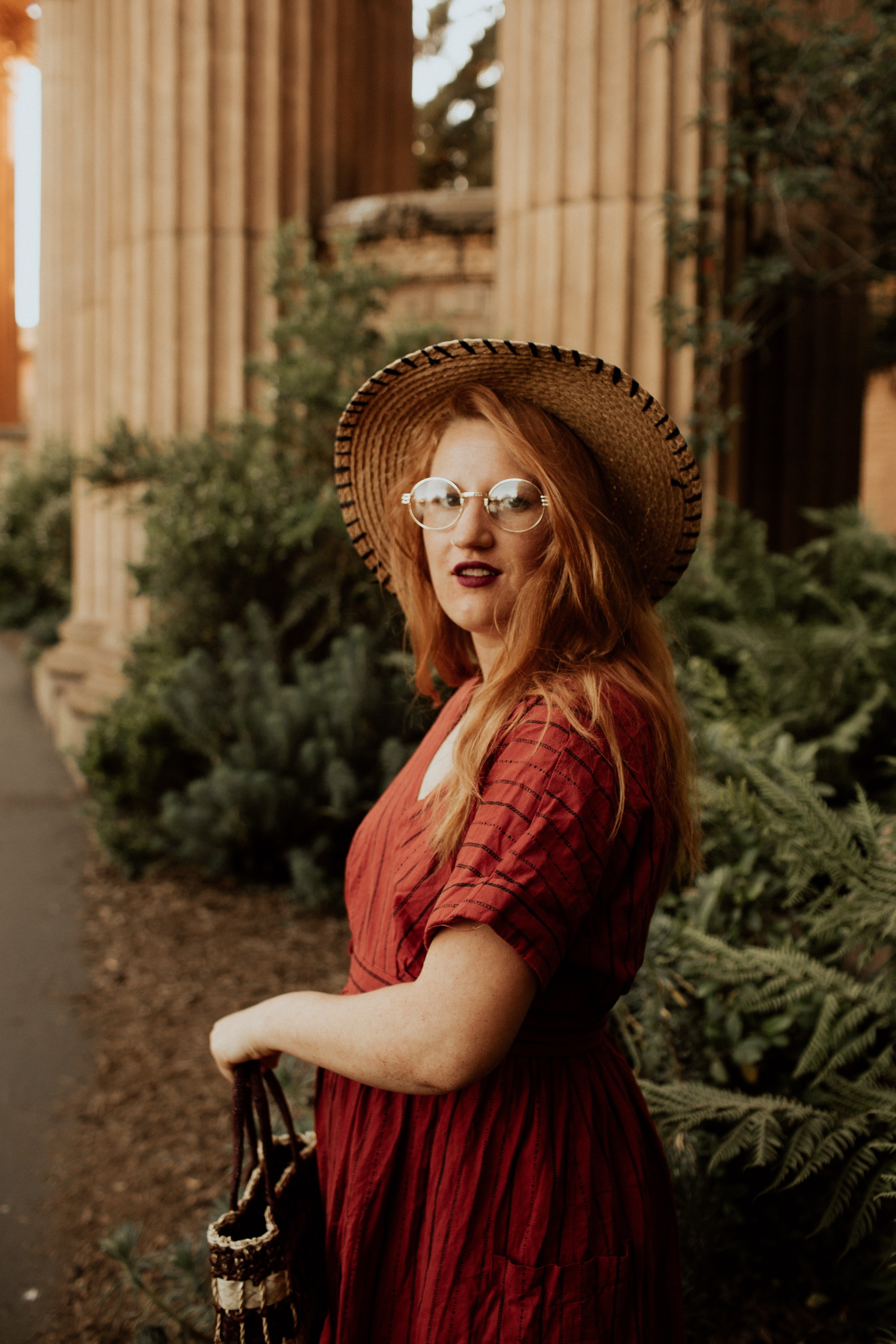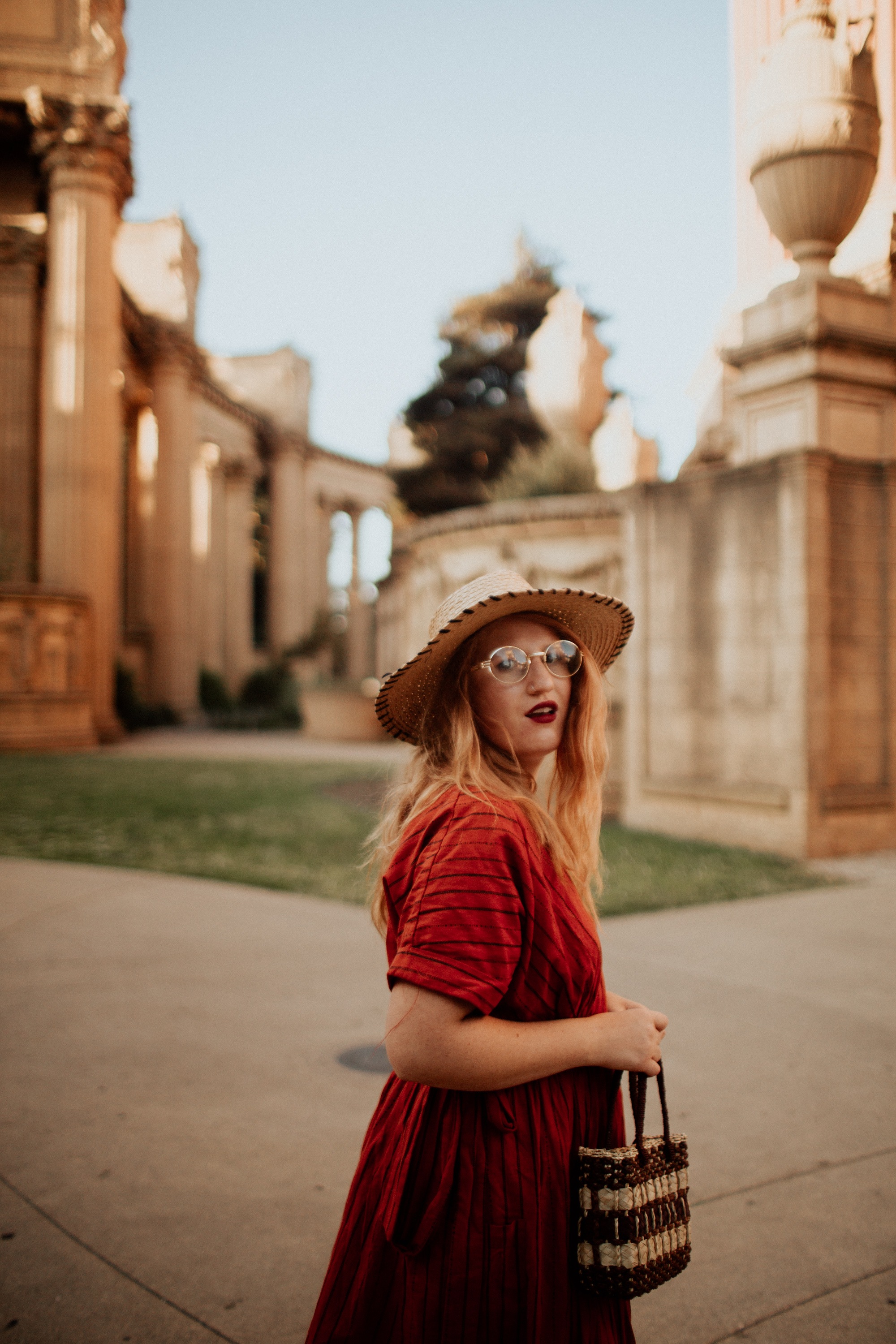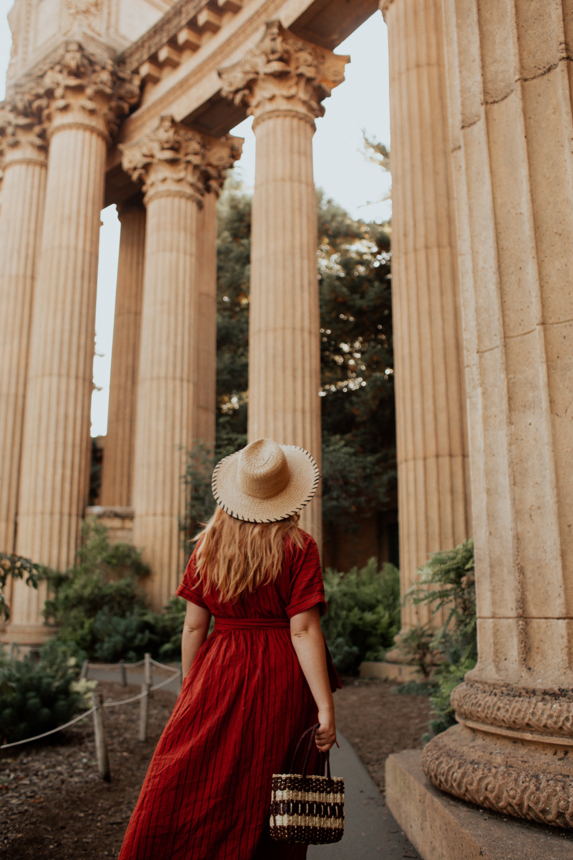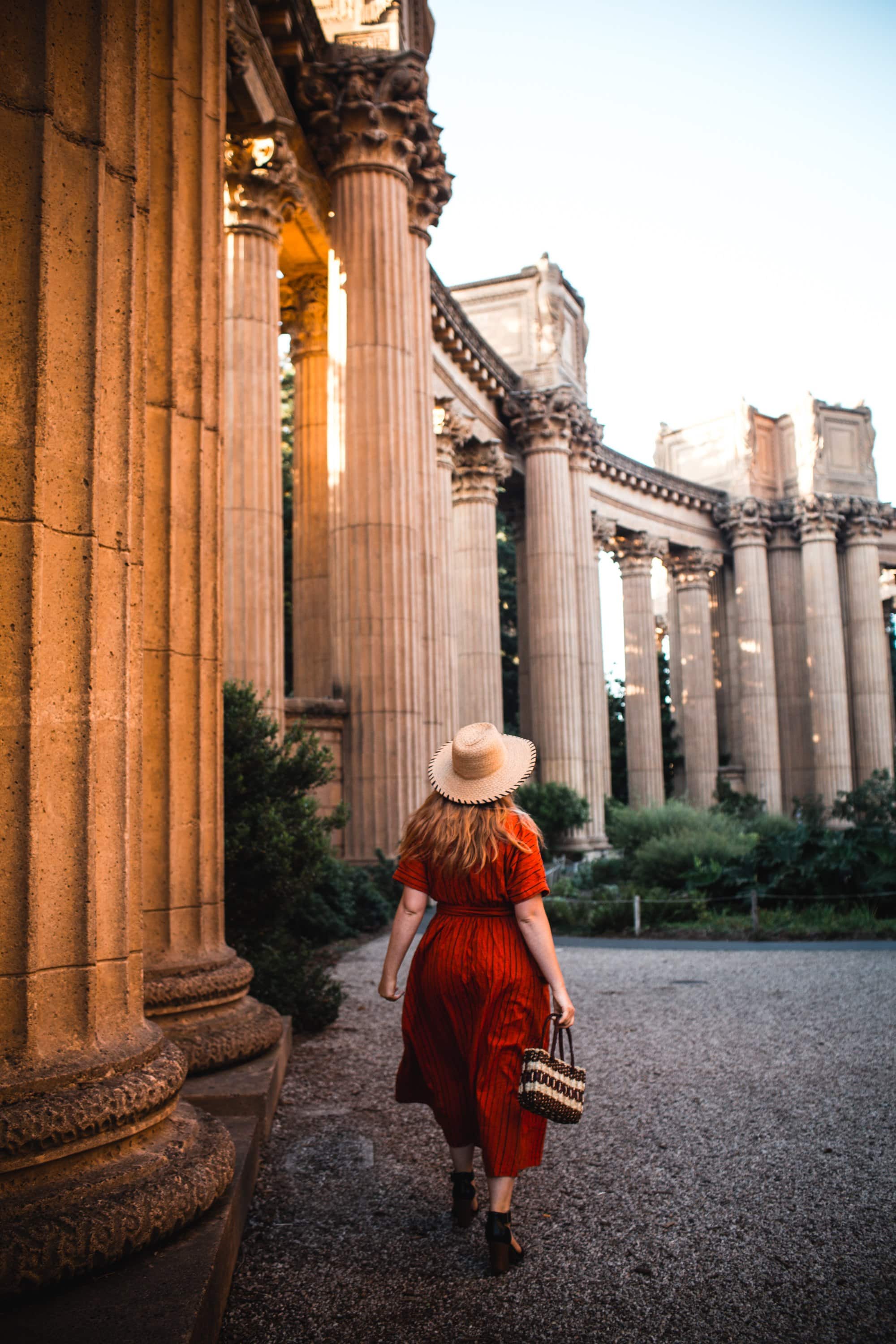 On this date night, I paired my dress wrap dress with sandals, a straw bag and a straw hat for a breezy summer night look. As I mentioned before, after walking around the Palace of Fine Arts, we swung by Safeway to pick up a 6-pack and watch the sunset behind the Golden Gate Bridge on Crissy Field Beach, just a little bit down the road from the Palace. I recommend doing the same, it’s such a great way to end the day!
