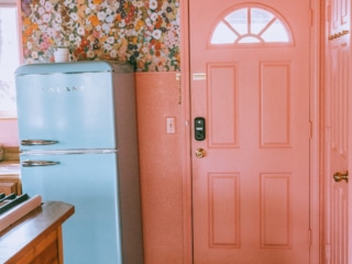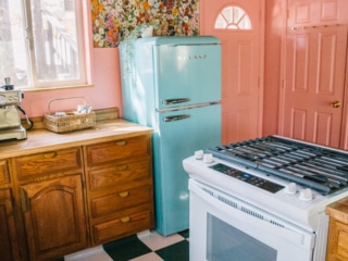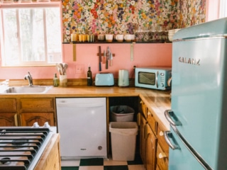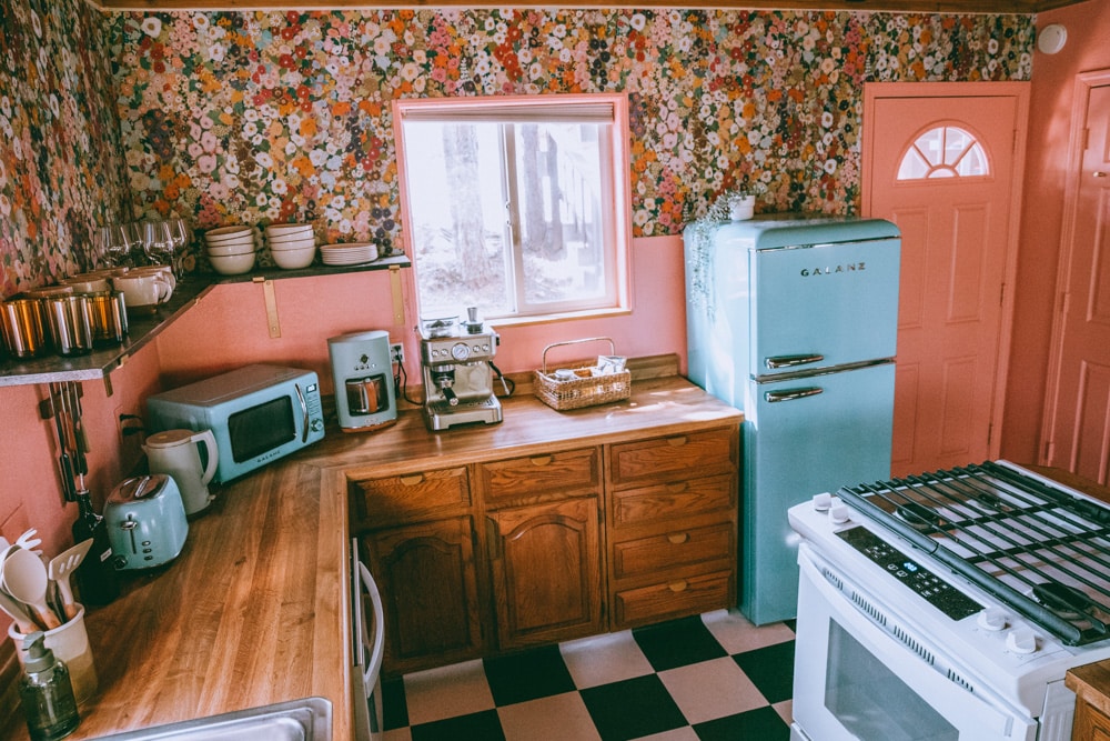 The black microwave and coffee maker wasn’t the vibe and I didn’t want matching pink appliances so instead I found this Galanz retro fridge ( it’s a great alternative to a Smeg fridge look for a fraction of the price!) When random service workers coming to the cabin to do things complimented the blue fridge and wallpaper, I knew I really hit gold on the design.