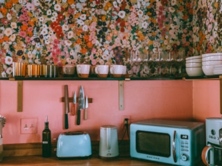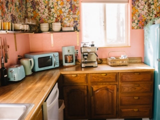 I did get a matching blue microwave and toaster, though, to keep the retro feeling throughout the whole room. We’re big coffee lovers, so we put in a fancy Casabrews espresso machine for guests, but also a Hayden drip coffee pot and a Hay Design pour over pot.