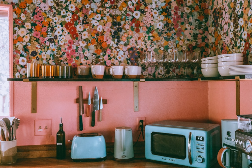 Instead of choosing pink kitchen accessories, I opted for baby blue. I think some people would have felt like neutral was a safe option, but blue is one of the color themes in our cabin and it really steps the room up to be bold, but in a good way.