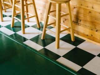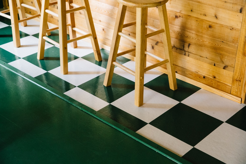 This cabin came with faux tiles via vinyl flooring that was all in one big sheet glued to the floor. I knew I wanted green and white checkered floors in order to bring in the green colors of the living room, but it was pretty much impossible to find green tile in the right shade that was within our limited budget.