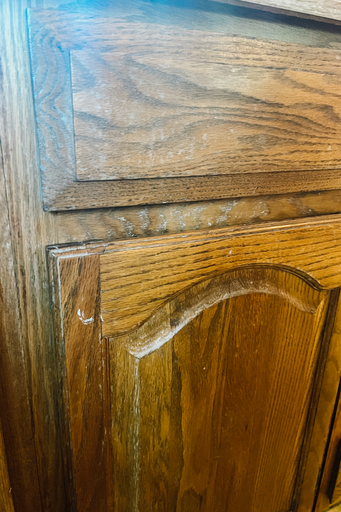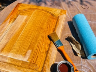 We really needed to do something about the cabinet doors. Since they are real wood and original from the 80’s, we decided to keep them and restain them.
