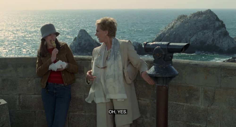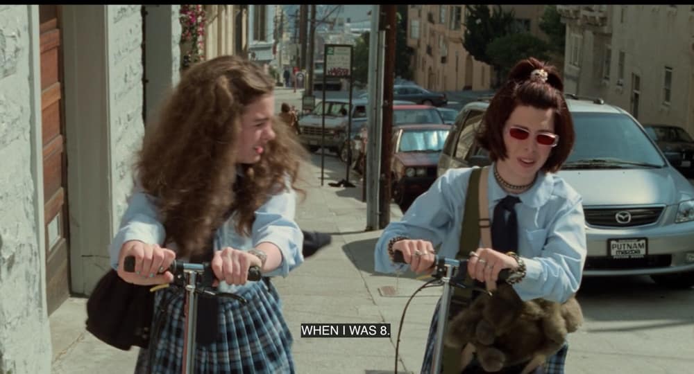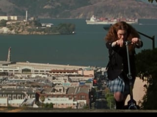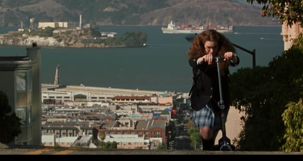 There’s a few scenes at the start of the movie where Mia somehow scootered that 7 miles from her house to Nob Hill and is shown pushing her scooter up a steep street. Then it cuts to Lily cruising along with the Transamerica building in the distance, and Mia joins her.