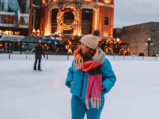 I make it a point to go ice skating every Christmas season and couldn’t pass up the chance to skate around Christmas trees in Quebec City. I rented skates at the rink by the Place D’Youville old walls rink, went at golden hour, and watched the lights flick on as the sky turned blue. It is small, charming, and surrounded by snack stalls so you can grab something warm afterward.