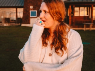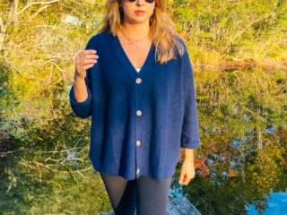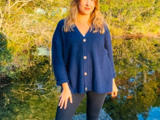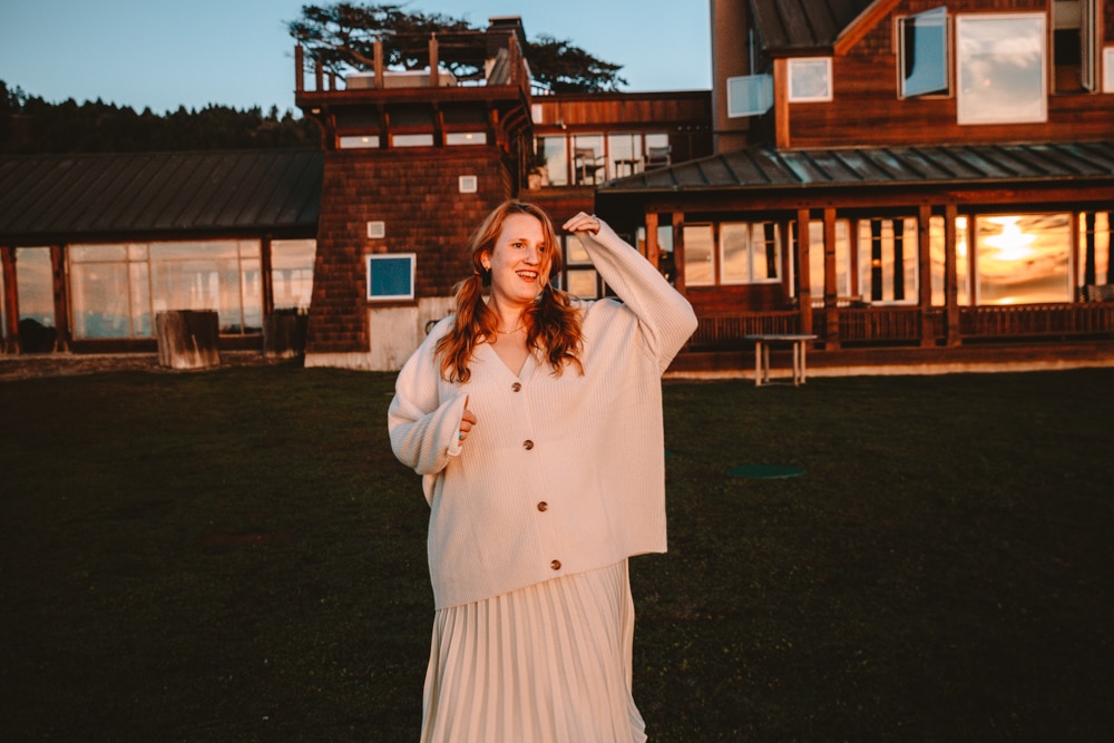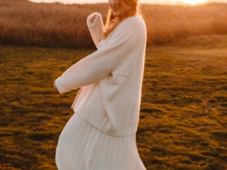 I’m a huge fan of layering sweaters over skirts, especially in the colder months. Here I styled my Ivory Boyfriend Cardigan with a white skirt and boots for an overall oversized look that was super comfy yet elegant for a fancy dinner at the ranch.