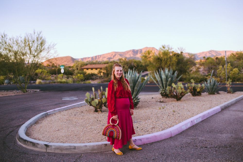 I dressed in this bright red and pink combo with yellow heels and a straw purse I picked up in Cabo last month. Both are lightweight fabrics that are perfect for the desert heat and made it easy to wear this in the hot afternoon through the evening for dinner.