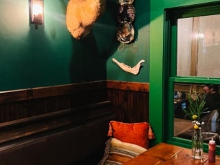 The whole vibe of the place is original and fun. The interior is painted green (very similar shade to my Whimsy Homes cabin so I loved it!) with taxidermy hanging on the walls and flowers styled in olive oil tins. Robin described it as a trendy hunting lodge and I think he’s right.