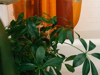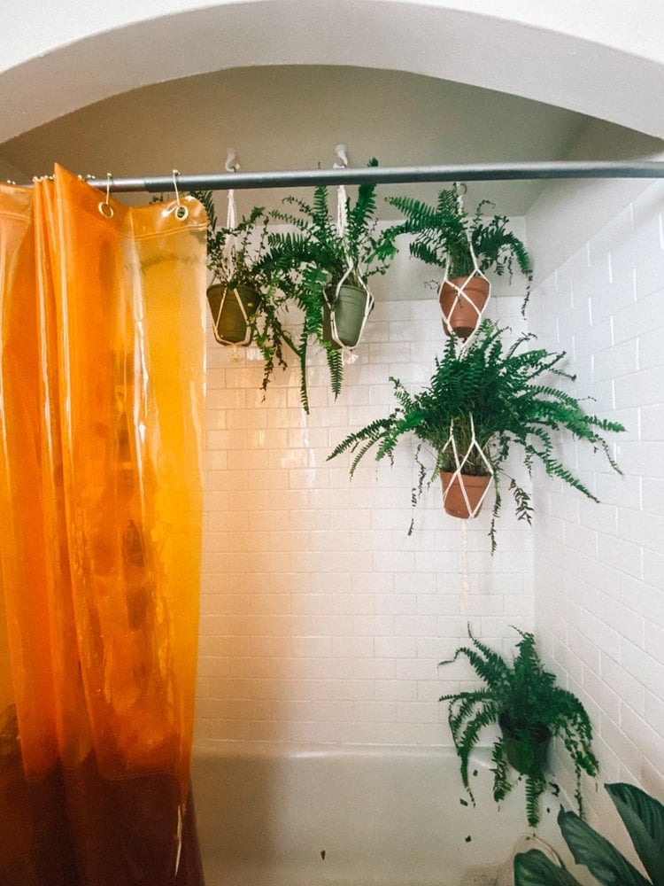 I have a clear shower curtain from Quiet Town Home, which not only is a cool design but it’s great for shower plants since it still allows light in through the curtain. The leaves of the ferns do sometimes fall down in the tub but they’re easy to scope out and keep clear of the drain.