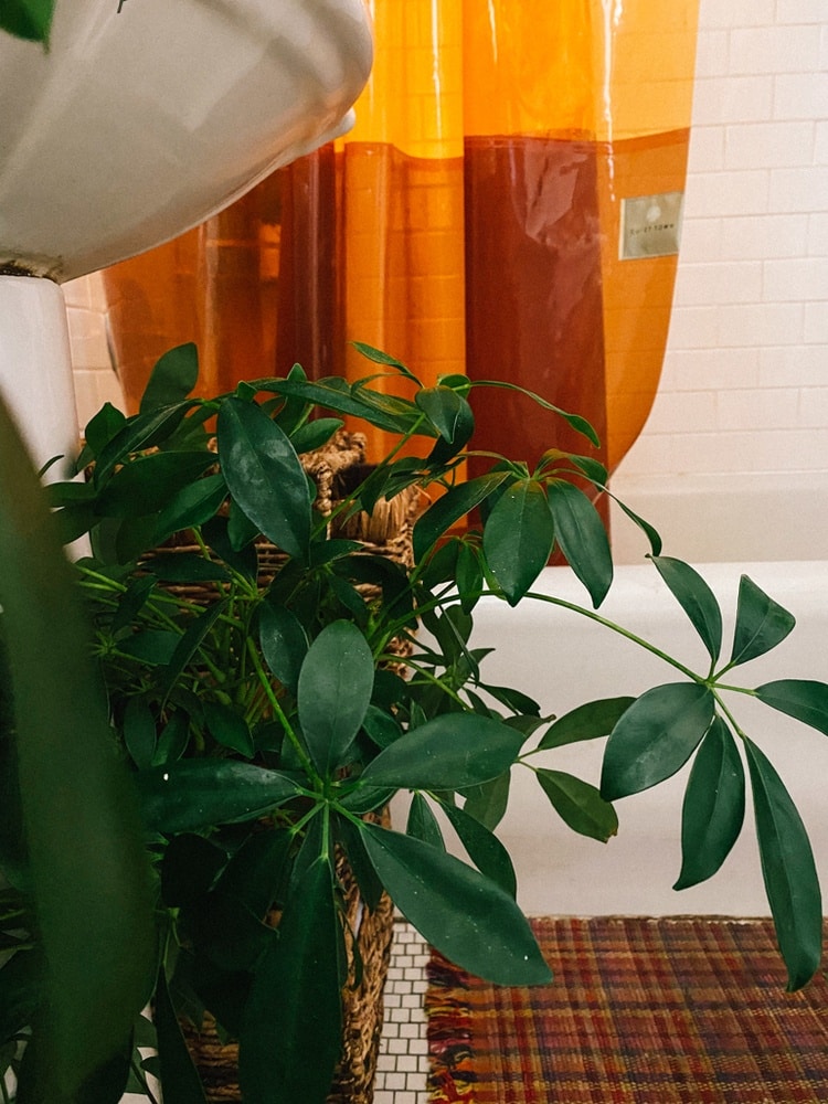 I also have an umbrella plant on the floor. These guys are tropical plants, so they don’t need bright light but do love humidity so that’s why they do well in this bathroom. Then there’s an aloe on my shelf and two air plants. The latter is really low maintenance, it sucks the water out of the air when we take showers so I really don’t have to mist it too much.