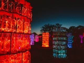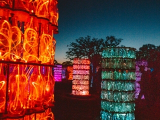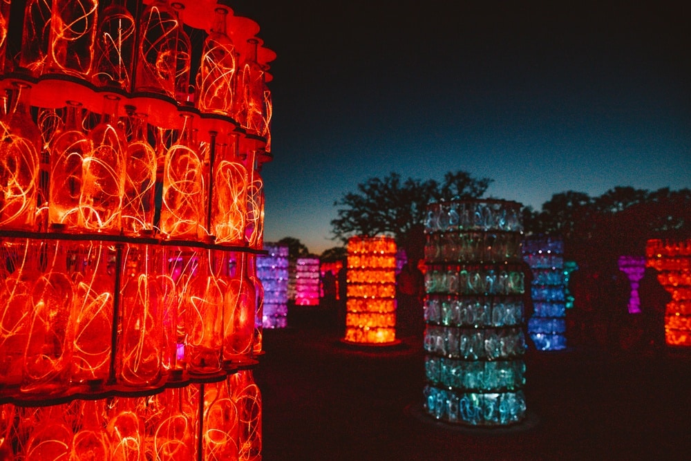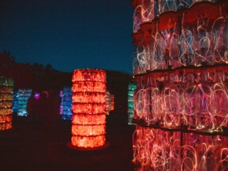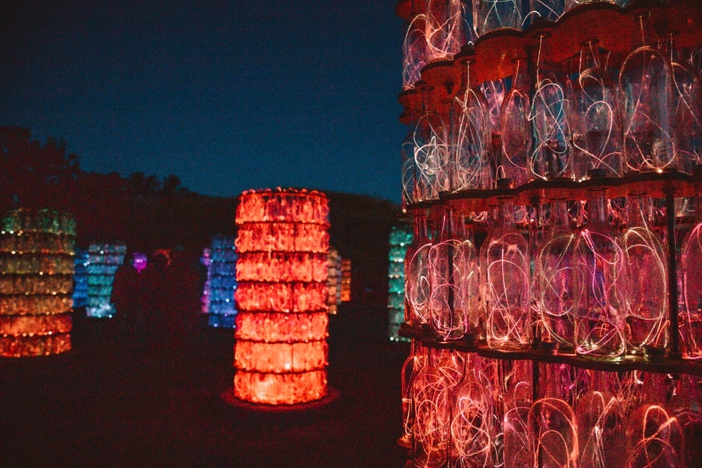 Sensorio used to just be a field of lights, but this year (2021) after it was decided the event will be permanent, a new installation was built. The new Light Towers pay homage to Paso Robles wine country in the coolest way possible. Made from over 17, 000 wine bottles which are illuminated with glowing optic fibers in different colors that change along with a custom musical score (which felt very Lion Kingy).