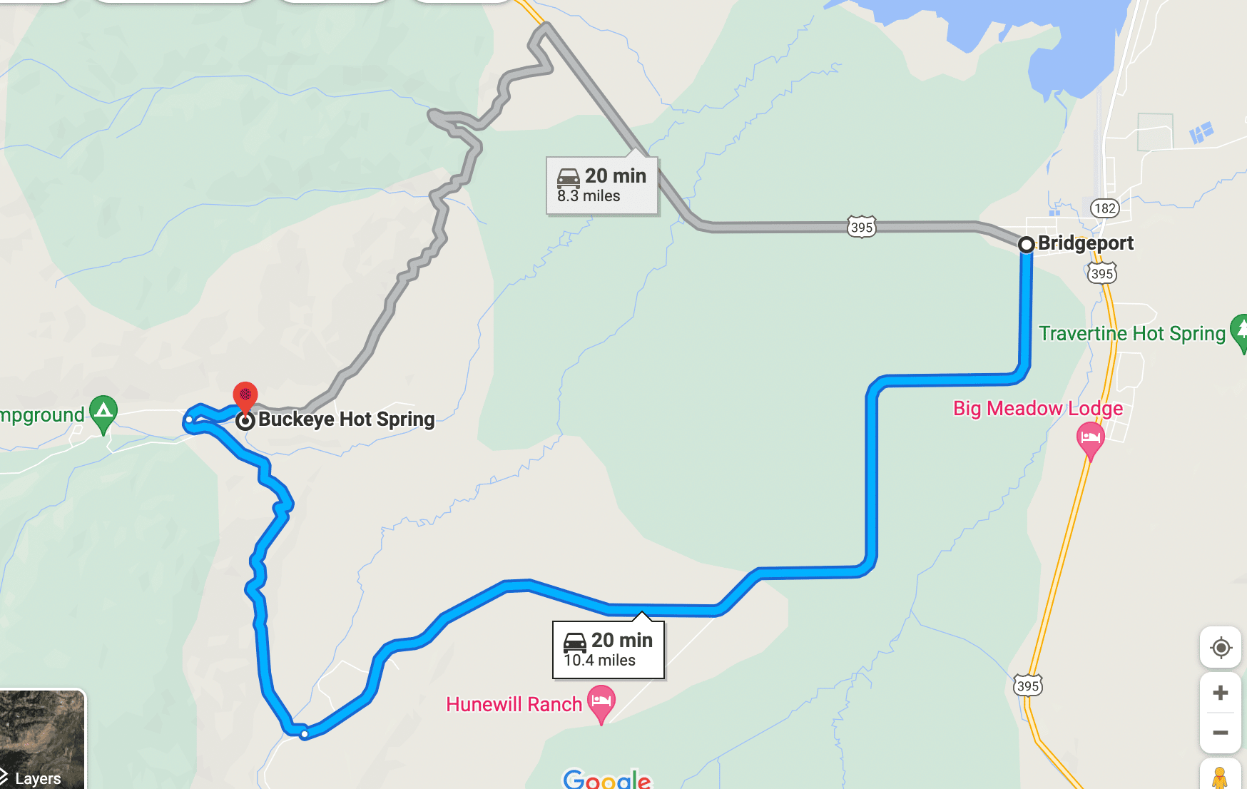 These pools are located near Buckeye Campground which is outside Bridgeport about 20 minutes drive. Make sure you use the gas station in town to fill up and download maps offline since there is no cell service as you get near the hot springs.