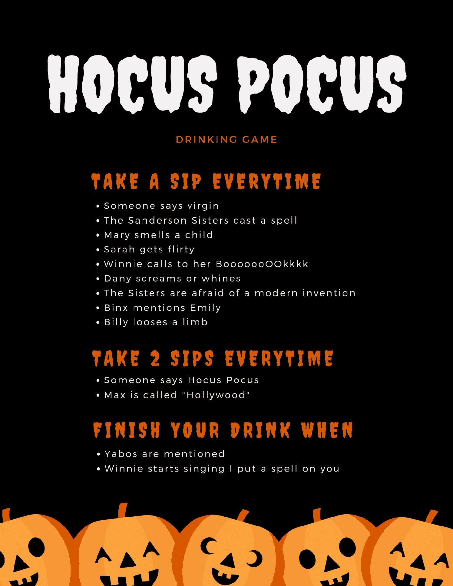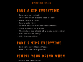 She was nice enough to let me share the list with you guys, and I updated for 2024. Plus Amy shared her own Hocus Pocus drinking game rules, which I highly recommend you play with your girlfriends and a LOT of wine. Bonus Points if you dress on theme as one of the Sanderson Sisters (personally, I love Sarah Jessica Parker’s look)!