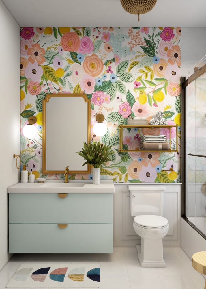 Bathrooms are great low-commitment areas to spice things up with wallpaper. Since you’re not staring at its walls everyday like you might in a home office or living room, feel free to steer clear of non-distracting neutrals or plain designs!