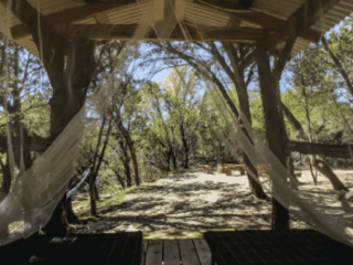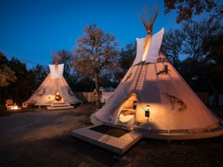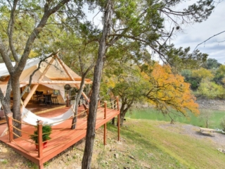 Glamping – Grand Aztec Tent at Talula Mesa is the epitome of glamping in Texas in the Lake Travis area. This tent comes equipped with air conditioning, a coffee maker, as well as a wood-stove just in case the night gets a little cool. During the day, you have the option to relax and take in the beautiful country views or explore the property and hop on a kayak, go for a swim or pick up a game of volleyball.