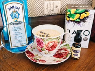 - While the tea steeps, add sugar, vanilla, lavender bitters (optional), and gin to your serving mug.