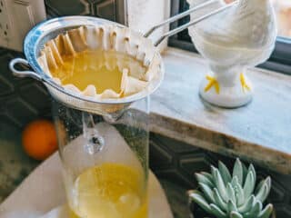 - Repeat the filtration process until you achieve your desired level of clarity, 2-3 more times. (Some liquid will be absorbed by the strainer each time you filter, so keep an eye on your yield.)