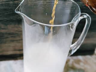 - Pour the heated milk into a large glass pitcher, then add the spirits mixture. It should start to curdle right away. Yes, this is what is supposed to happen! (IMPORTANT: The rum mixture must go into the milk, not the other way around, for best curdling.)