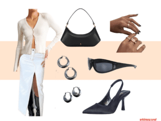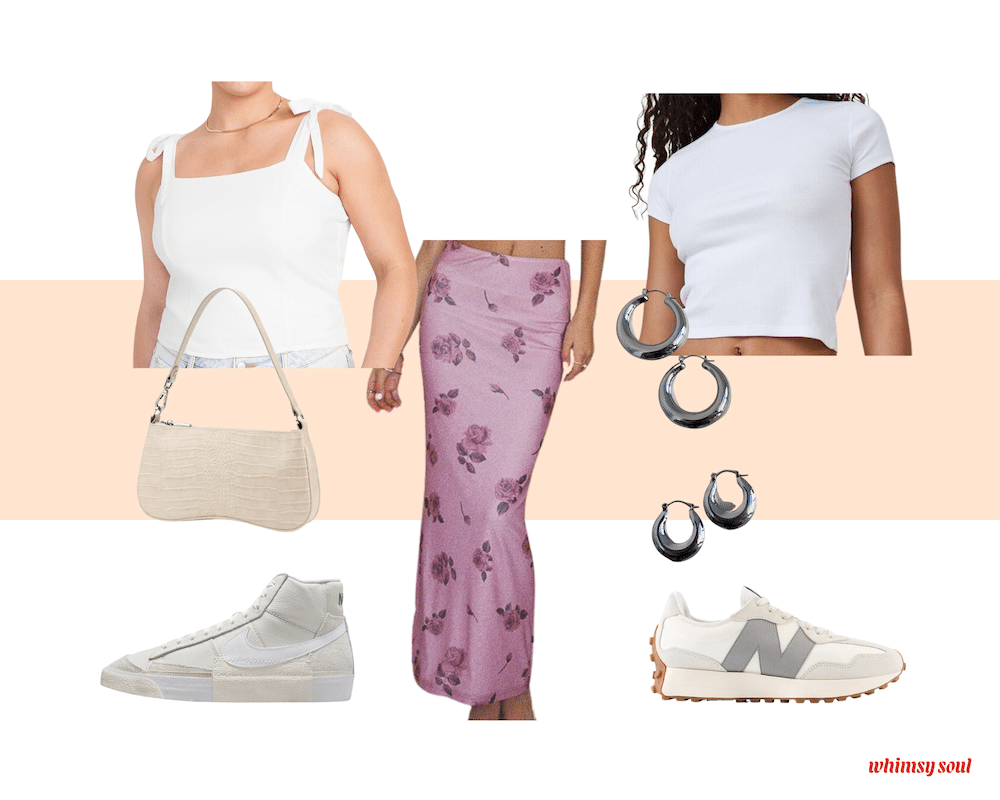 This denim white skirt with an open slit for your leg looks so good paired with a white cardigan to create a monochromatic look. Or pair it with a simple tee for a more casual look. For some color, I added this pink floral midi skirt for inspo.