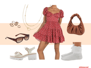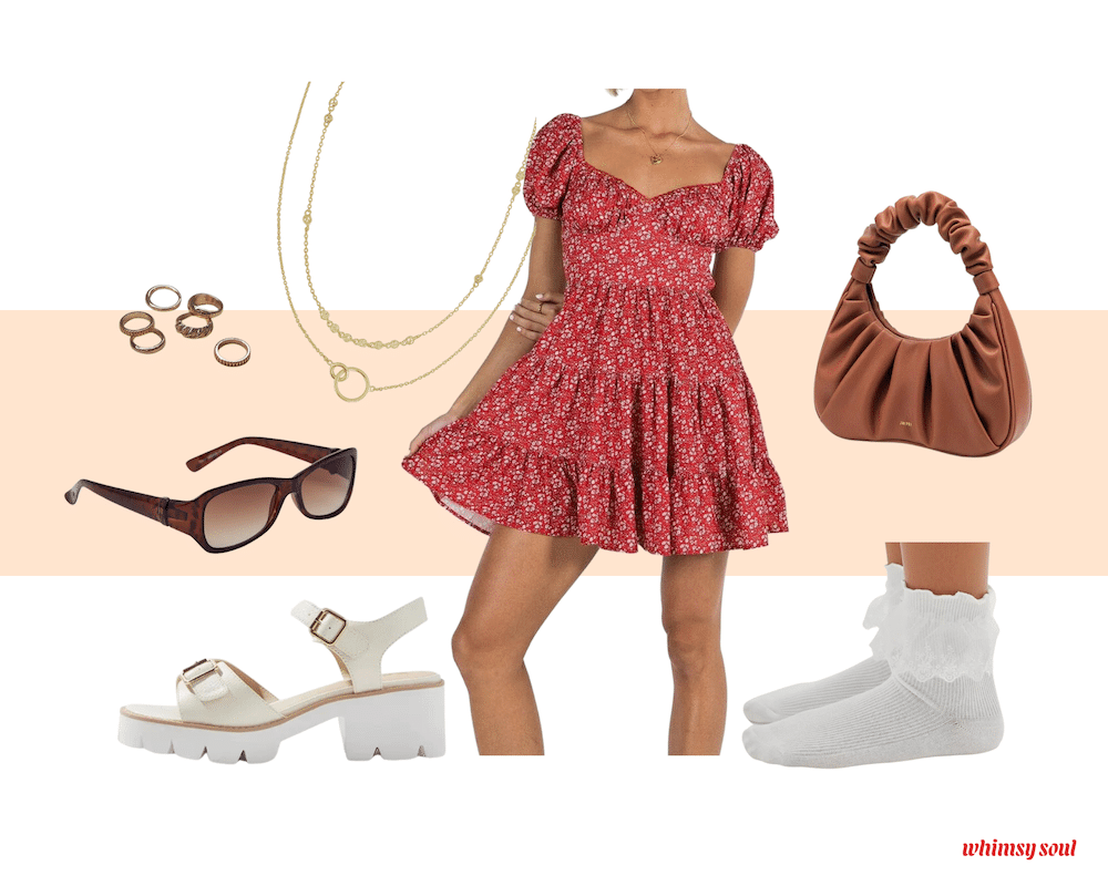 I included this cream seagrass mini dress with cutouts from Oak + Fort. I love the cutouts for a little peekaboo moment and the puffy sleeves for added detail. This red floral dress from Princess Polly is also perfect to make a statement. I love the flowyness of the tiered skirt and the style on the back of the dress.