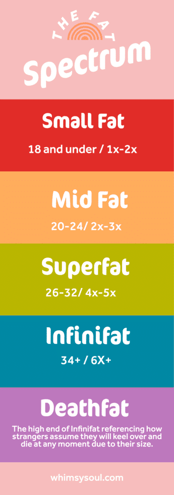 Something about sizing that many people who aren’t apart of the fat community often miss is that there are levels to fatness and privileges within each level. The first time I’ve ever heard of the fat spectrum was from The Fat Lip Podcast. Instead of seeing this spectrum as gatekeeping or a singular solid source, view it as a gateway to discuss privileges each fat person holds.