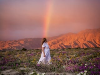 But, the real highlight was this crazy rainbow appearing out of nowhere around 6am!! We got these insane photos with the flowers, rainbow and soft pink sunrise sky. It felt like a movie.
