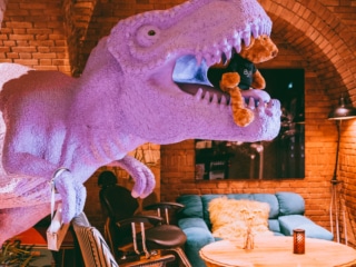 So, this hotel has all the vibes. There’s a giant dinosaur in the lobby to greet you when you walk in, hip decor, moody lights and a self check-in to quickly get you into your room.