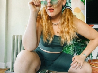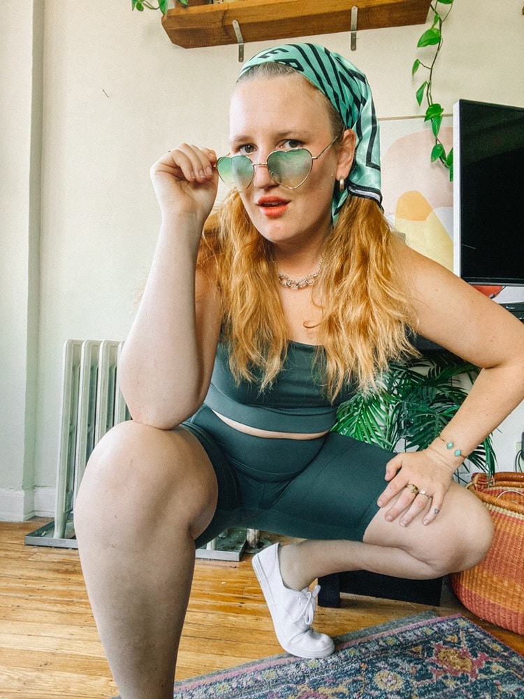 I got it solved that morning but I still had all the lingering stress hanging out in my body. So I decided to take Robin to Hook Fish Co for an impromptu lunch of fish sandwiches and poke to shake myself out of the funk. I had pulled on these Girlfriend Collective leggings and matching bra that morning, and they transitioned perfectly from errands to couch to lunch. White shoes comfy enough to walk all around town in, paired with a headscarf (thrifted), gold necklace and green heartshaped sunglasses (similar here.)