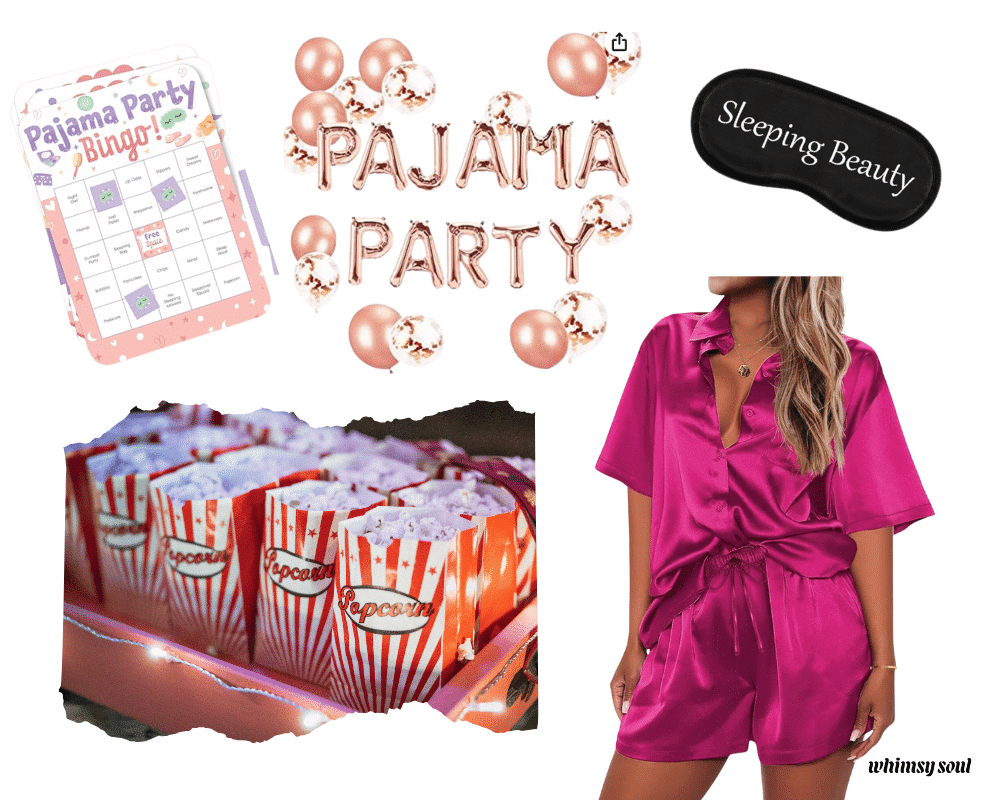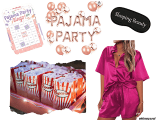Everyone obviously needs matching PJ sets, personal popcorn, and some fun sleep masks for a perfect night. A great game to play would be a drinking game correlating with the bride’s favorite movie and some fun pranks for whoever falls asleep first!